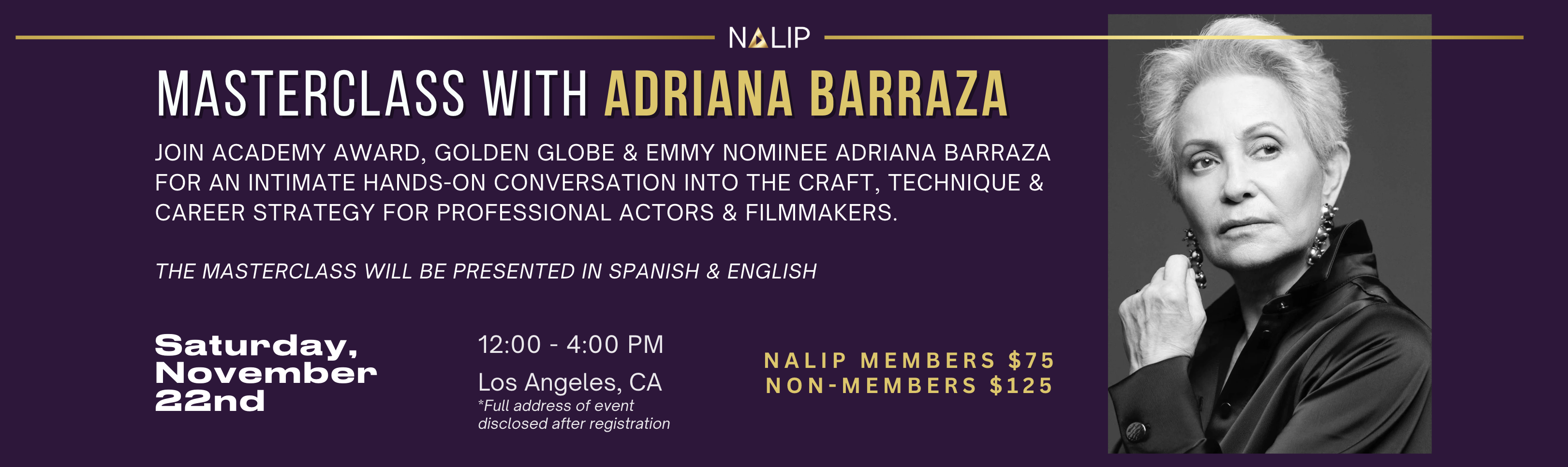 Join Academy Award, Golden Globe and Emmy nominee Adriana Barraza for an intimate hands-on conversation into the craft, technique and career strategy for professional actors and filmmakers. Maestra Barraza brings over 50 years of experience as a teacher, actress and director in film, television and theatre to special masterclass conversation.