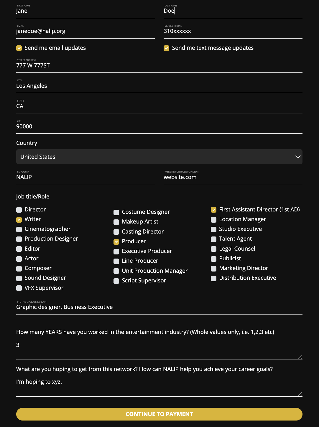 - If your form refreshes when you select "continue to payment," follow the formatting of the form example below. Additionally, enter the years as whole numbers only (without adding the word “years” at the end).
